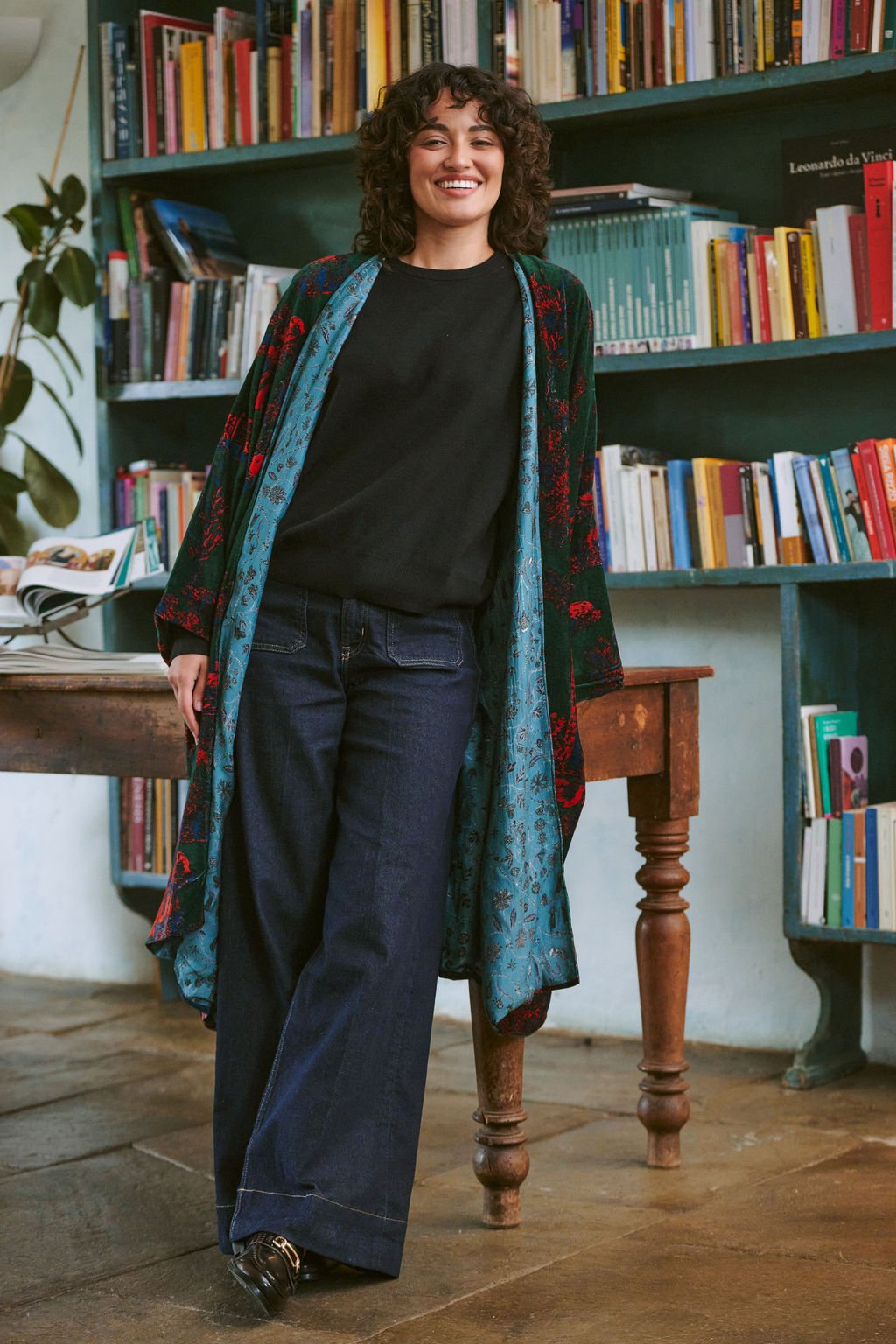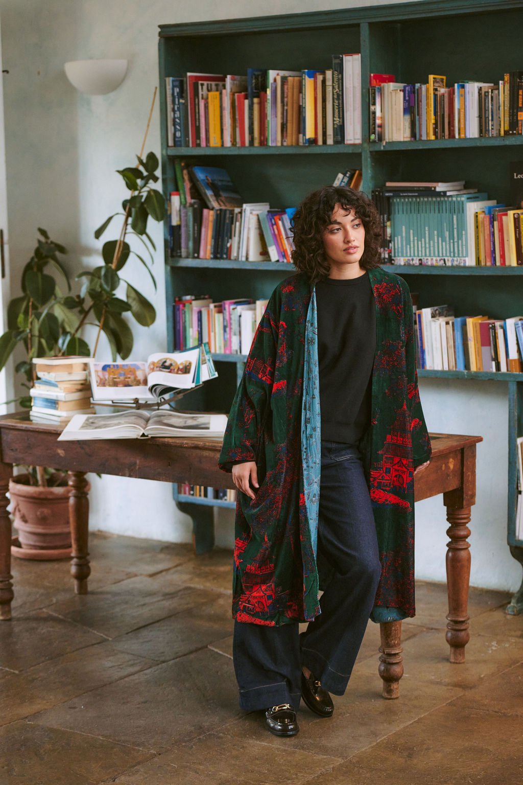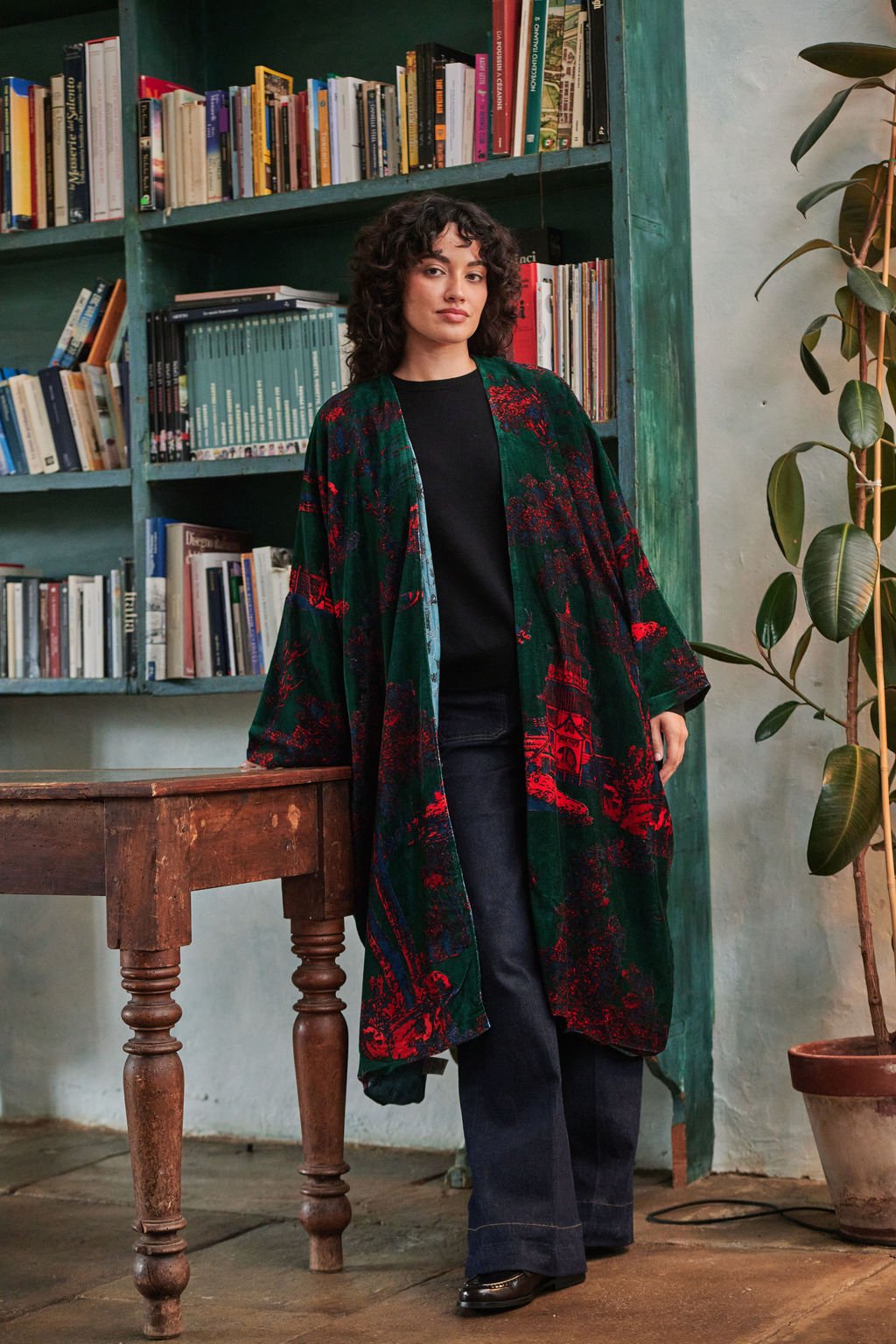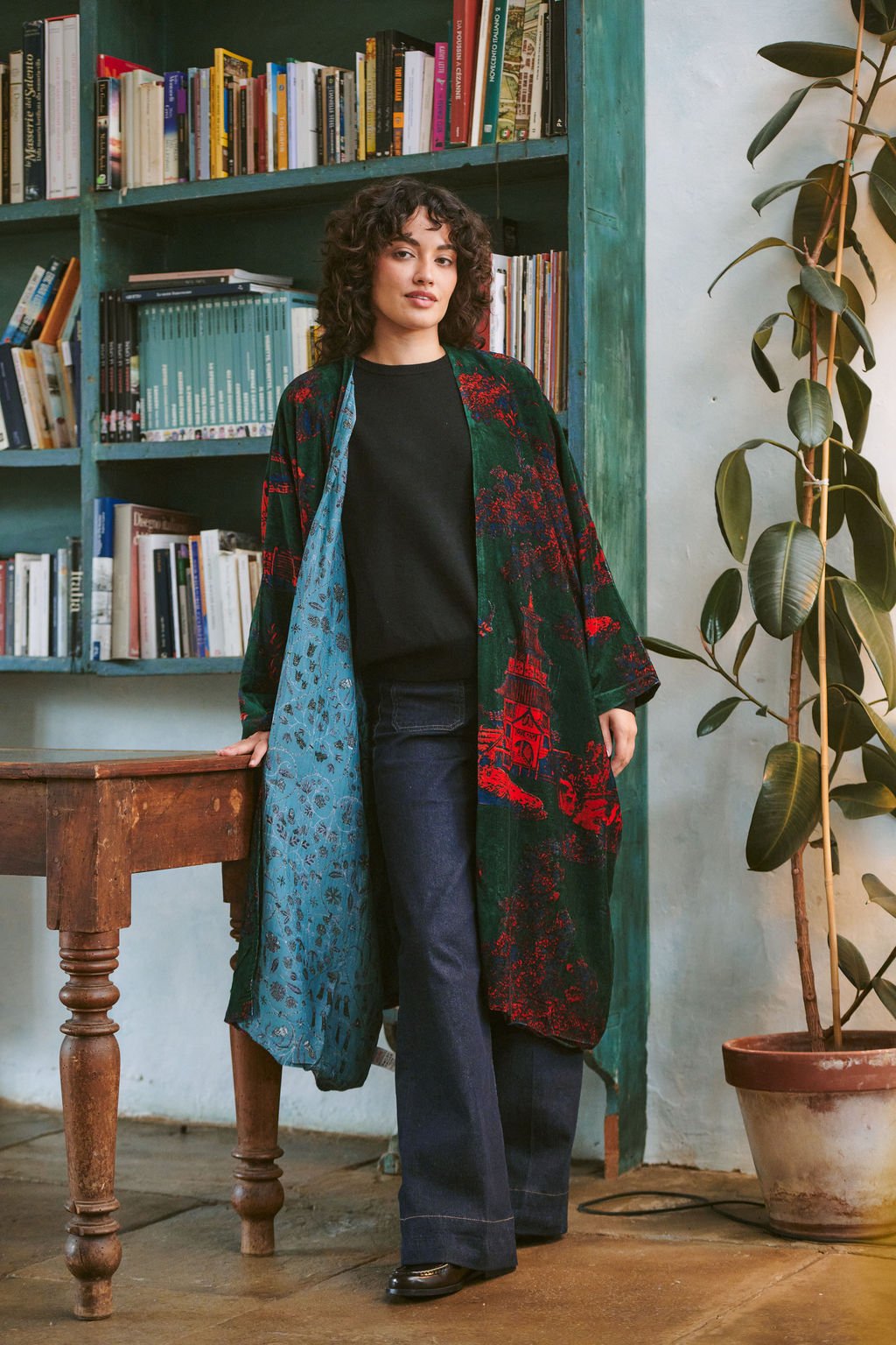 A luxury statement piece showing the full beauty of our bold signature designs. Made from soft cotton velvet with a complimentary printed lining, loose-fit sleeves, and hidden side pockets.