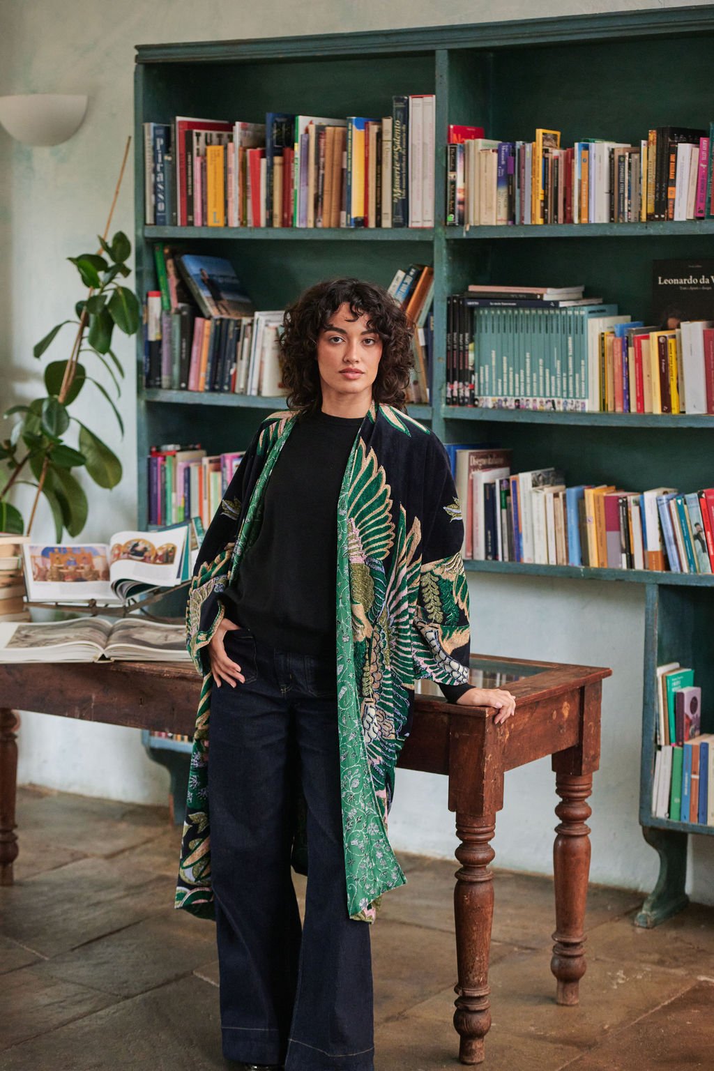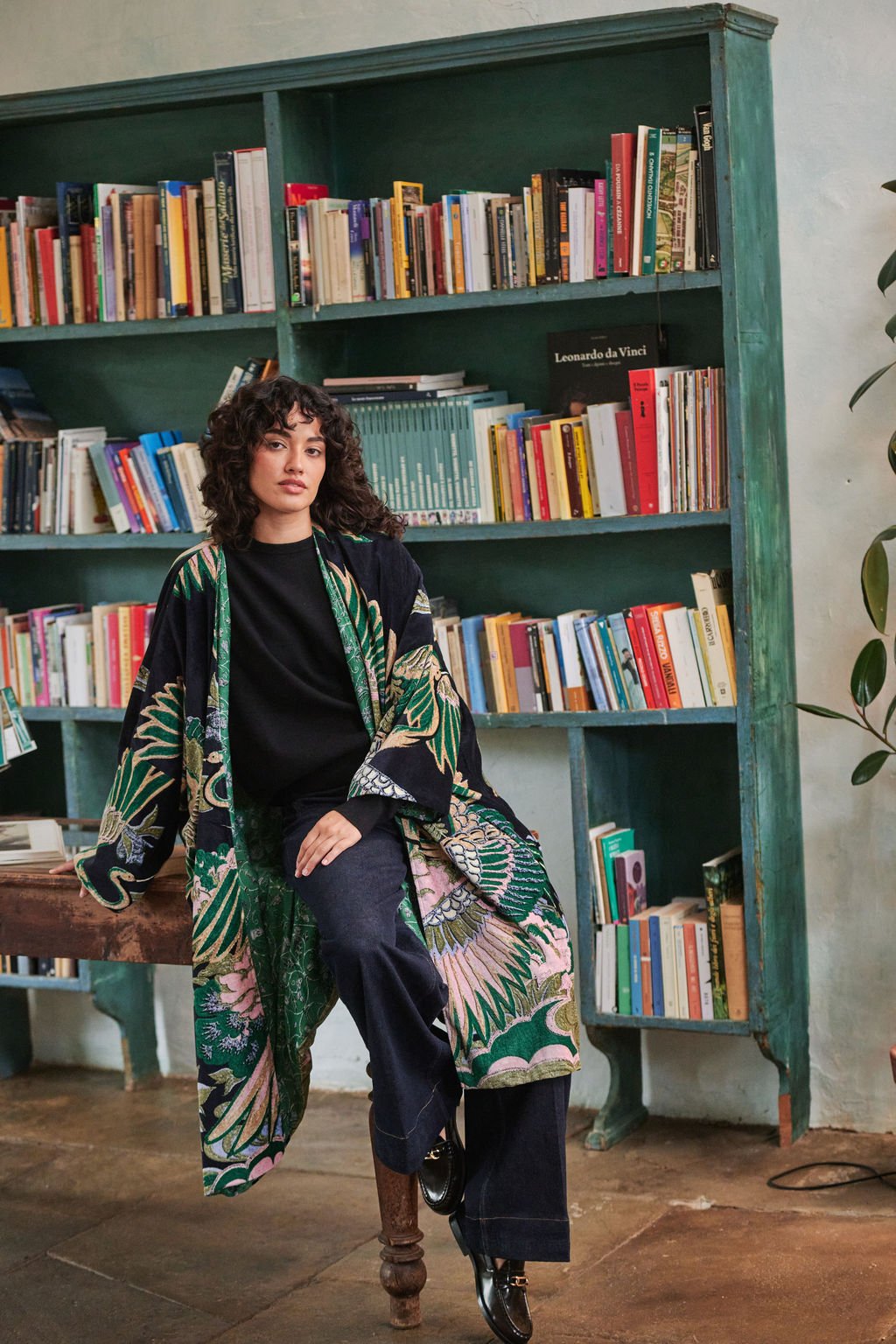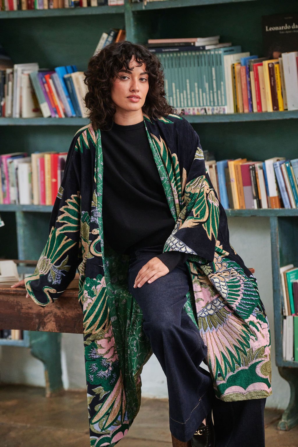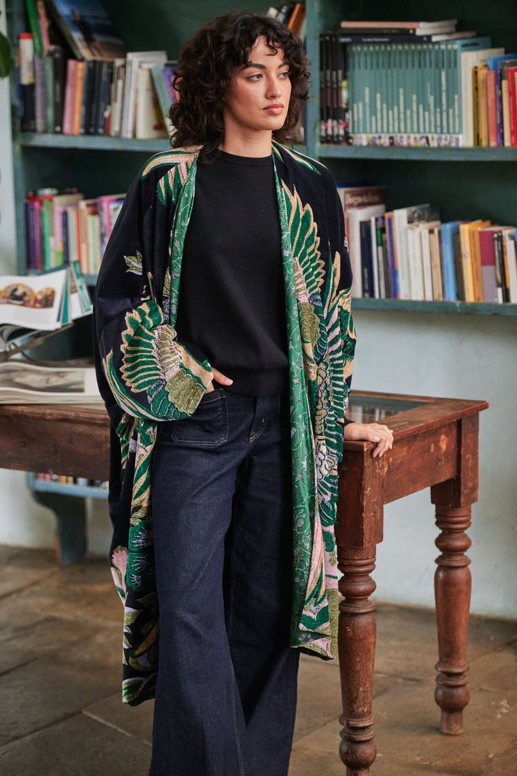 A luxury statement piece showing the full beauty of our bold signature designs. Made from soft cotton velvet with a complimentary printed lining, loose-fit sleeves, and hidden side pockets.