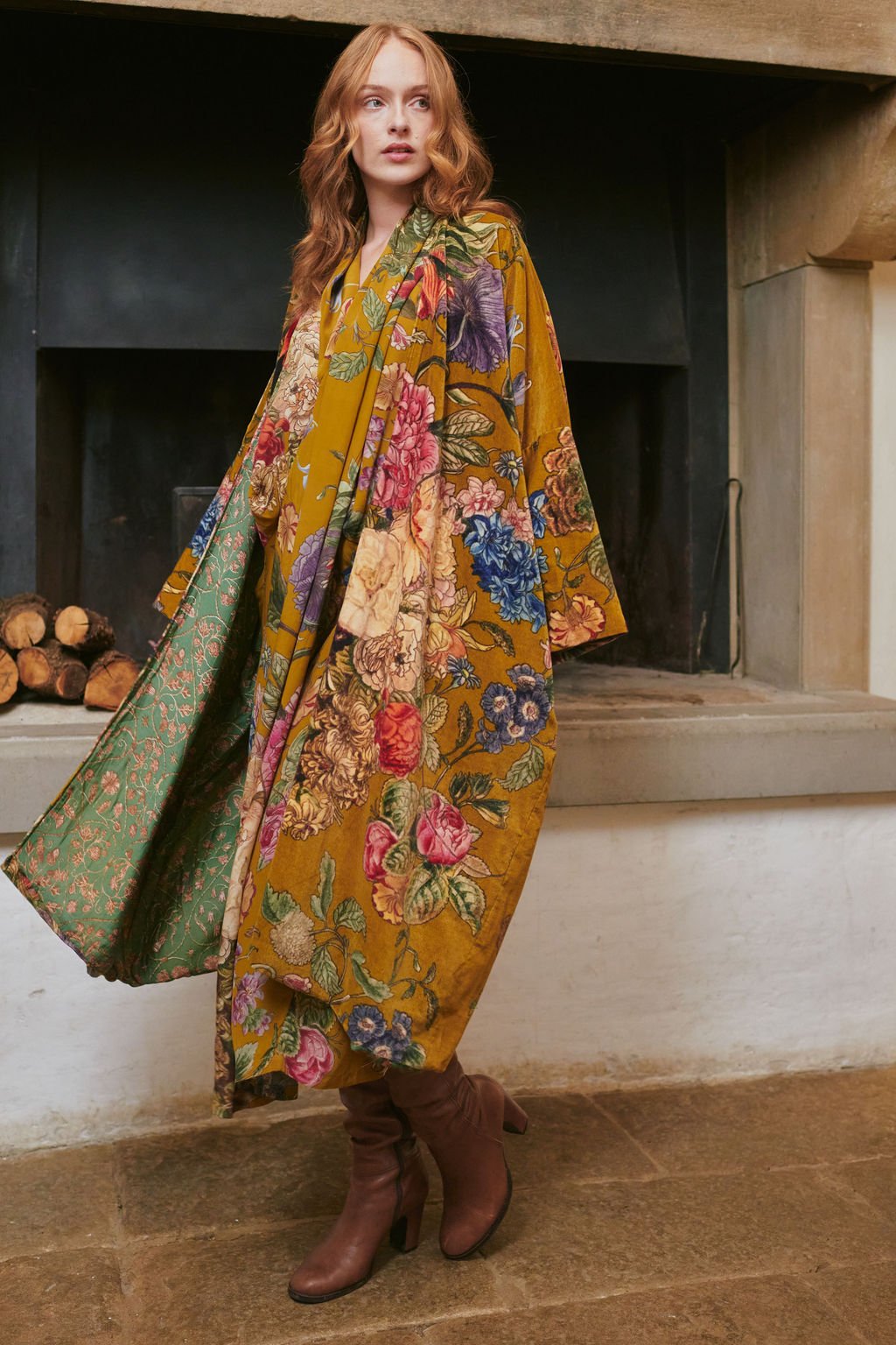A luxury statement piece showing the full beauty of our bold signature designs. Made from soft cotton velvet with a complimentary printed lining, loose-fit sleeves, and hidden side pockets.