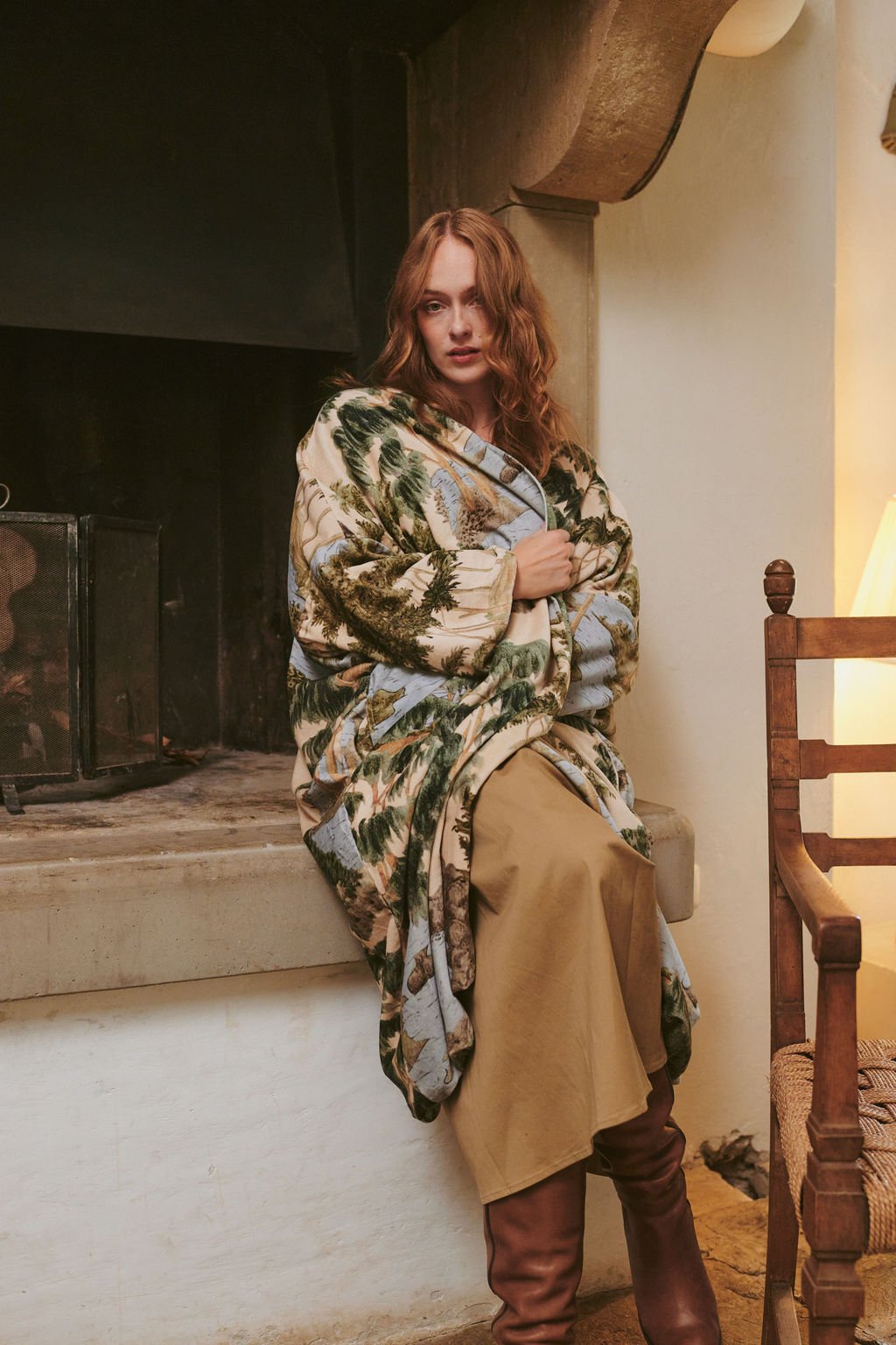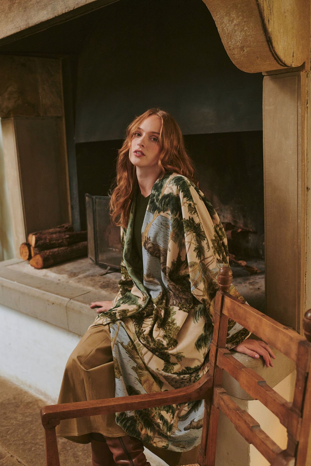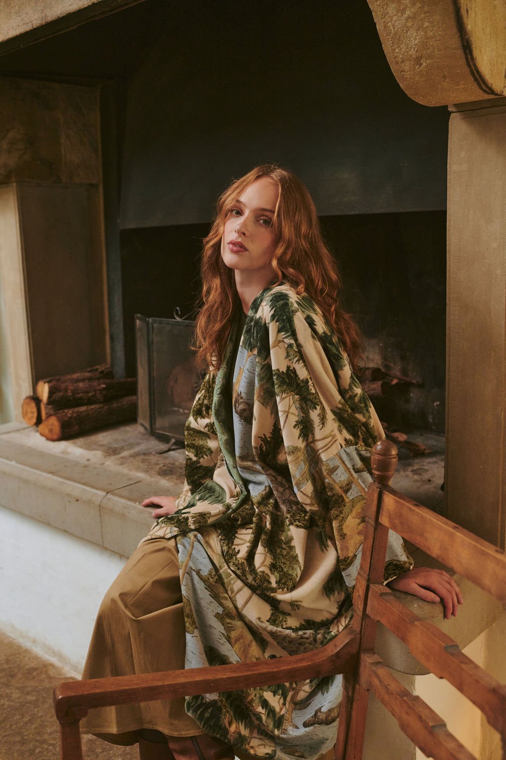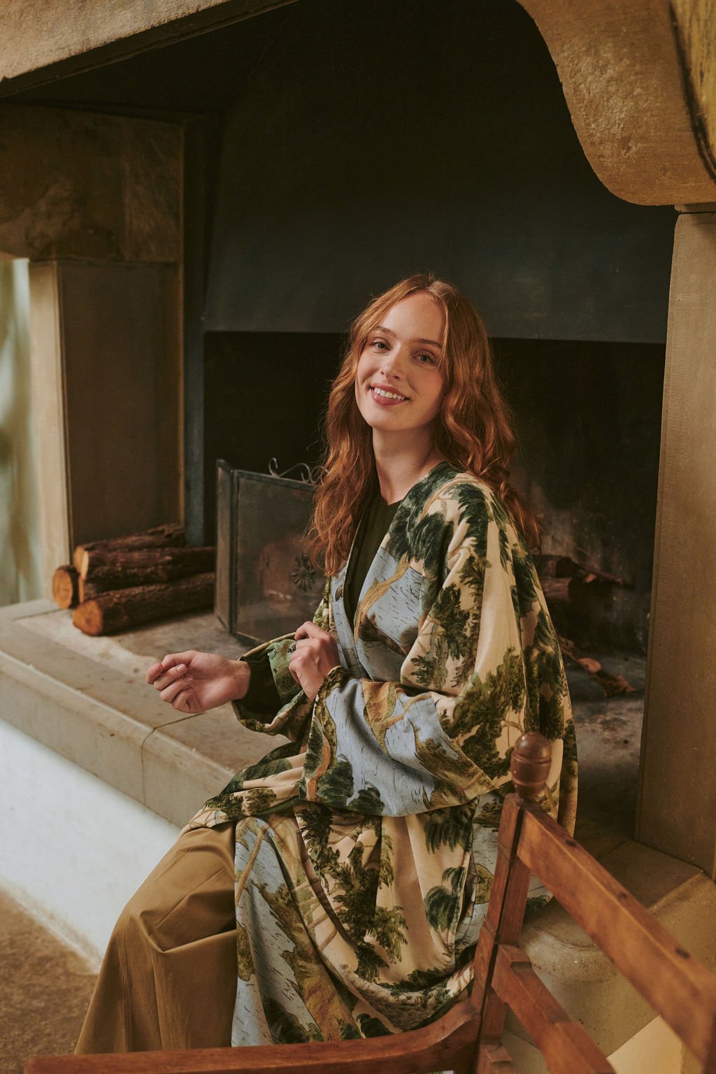 A luxury statement piece showing the full beauty of our bold signature designs. Made from soft cotton velvet with a complimentary printed lining, loose-fit sleeves, and hidden side pockets.