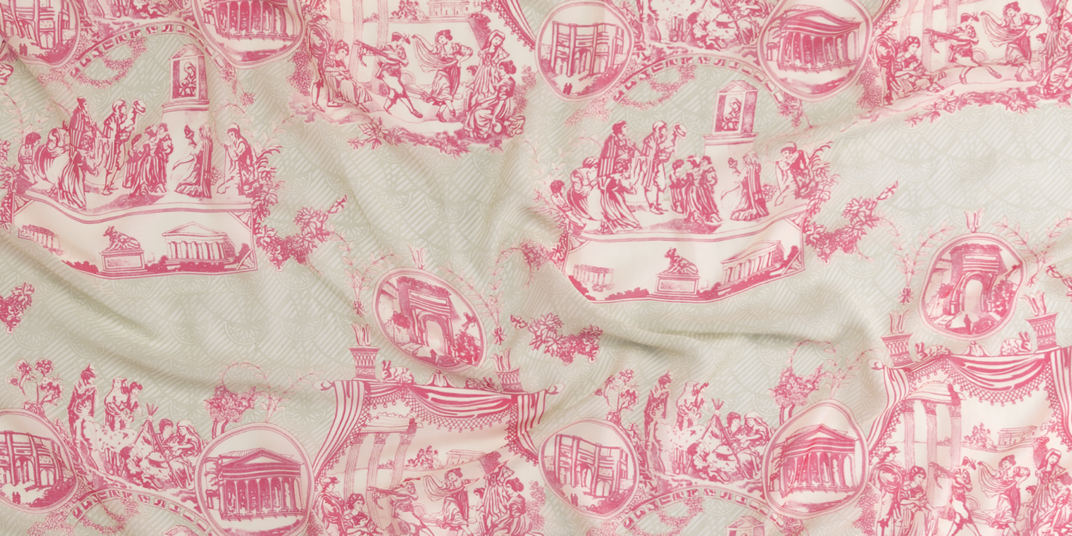 The Ancient Columns Charcoal print is inspired by classic French Toile De Jouy fabrics but with a twist. It features delicate sketches and detailed scenes of ancient Roman and Greek architecture. This monochrome colourway features deep charcoal greys making it eminently wearable any time of year!