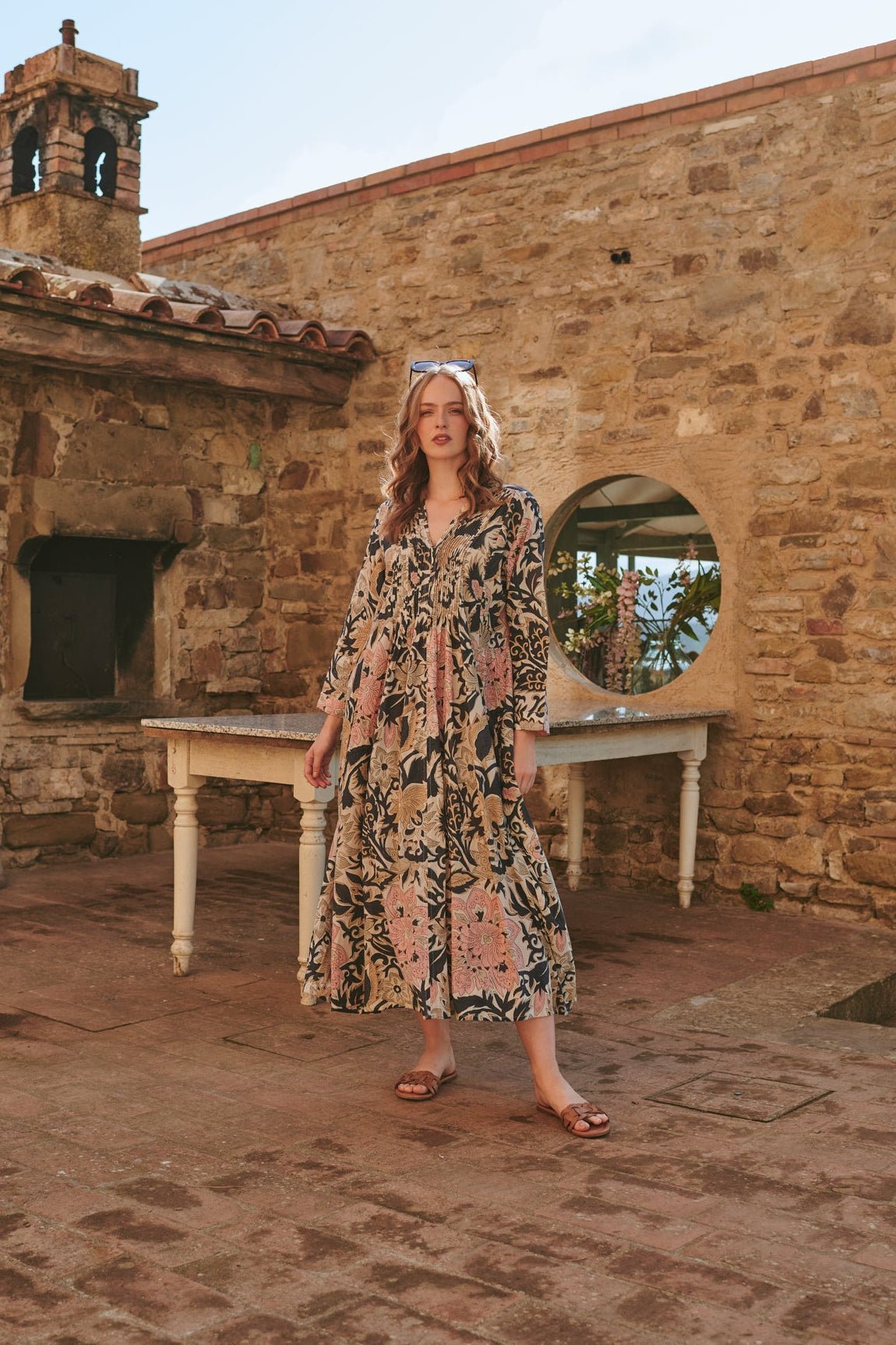 With its delicately pleated placket top leading down to a flowing maxi skirt, this dress showcases the entire One Hundred Stars signature print.