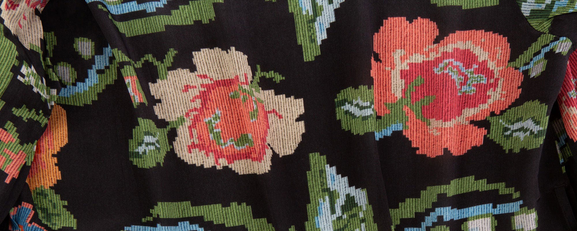 This woven floral print cleverly mixes traditional crafts and modern techniques to create a graphic pixel-style print with a cool vintage air to it.