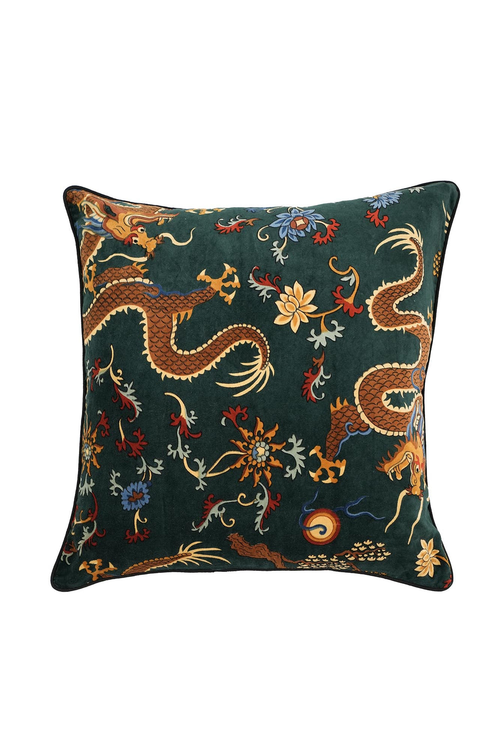 The Chinese dragon, or Lóng, has inspired this print. We have used deep, rich complementary colours to give a fresh look to the vintage pattern. Heavy background colours with gold dragons moving over the print and finished with a geometric border.