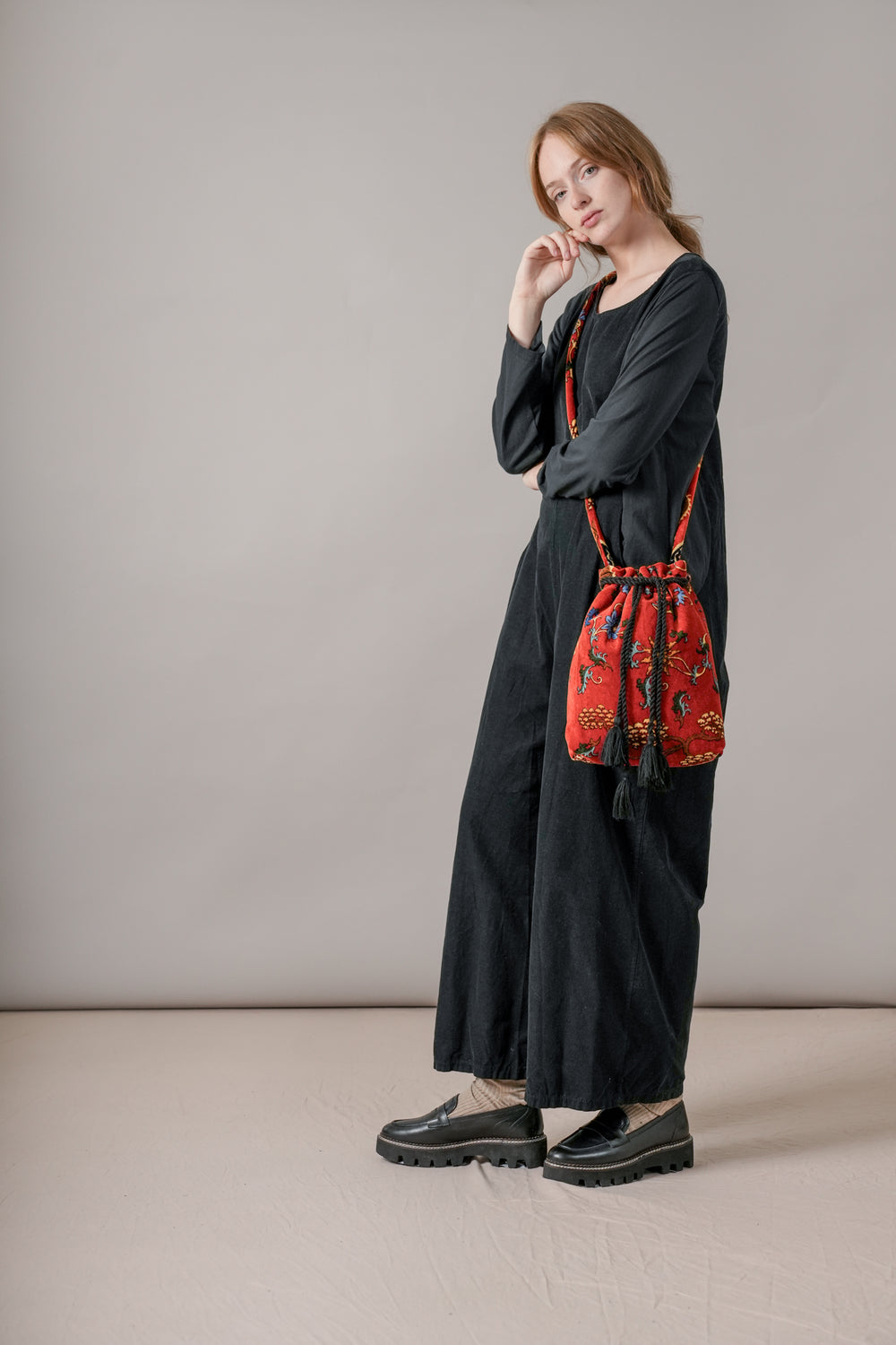 A cotton-velvet cross-body bag. Wear with our sumptuous velvet AW pieces or alone for a pop of colour. It has a large main pouch with a tassel drawstring opening and a single long soft velvet strap.