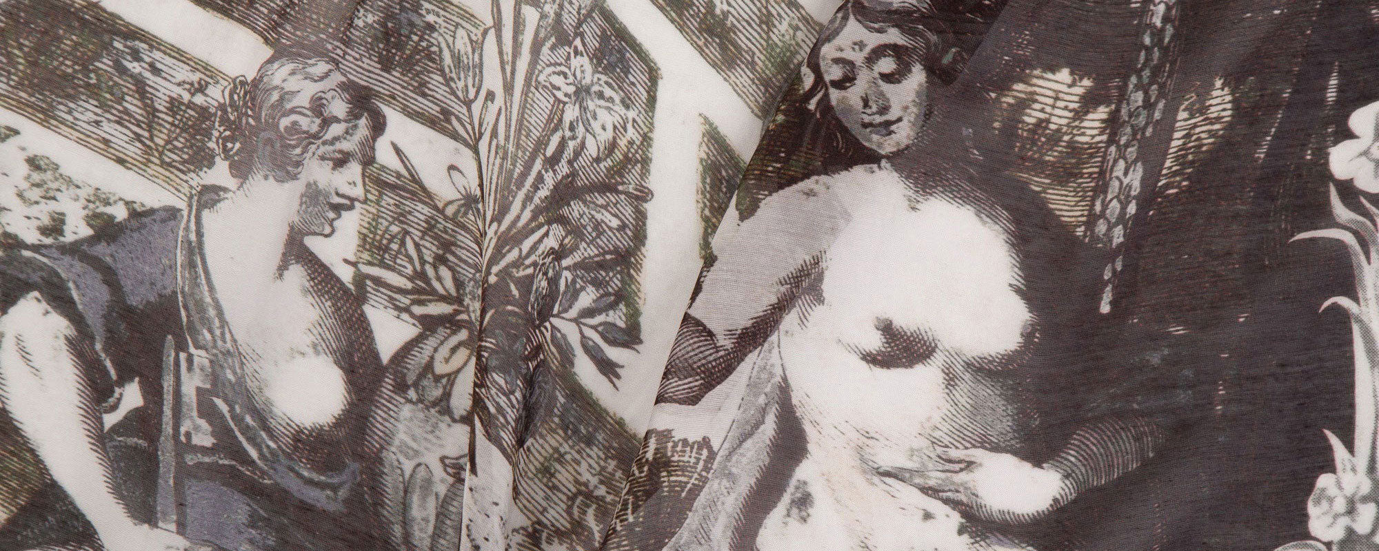 This scenic print features gardens and sculptures inspired by the Palace of Versailles and Louis XIV - The Sun King. Carefully coloured in tones of black, grey and subtle green, Sunburst is perfect for anyone looking for a slightly more edgy print within our Autumn Winter collection.