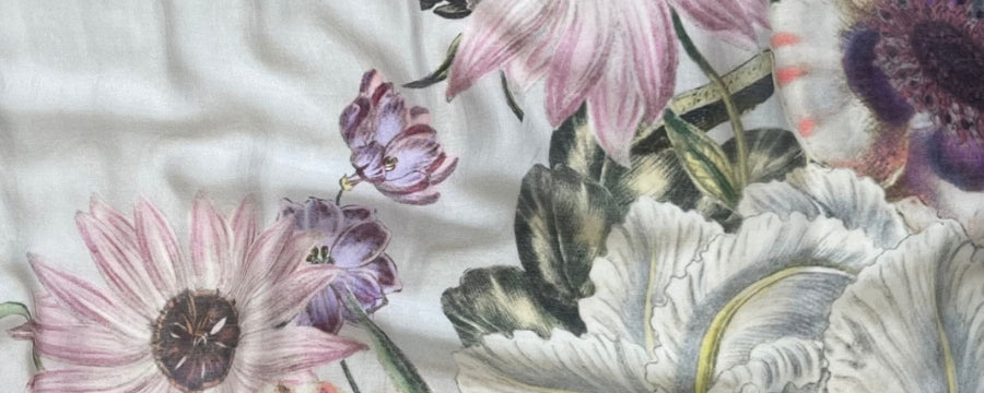 This print features a brilliant bouquet of English flowers from giant daisies to flourishing Iris.