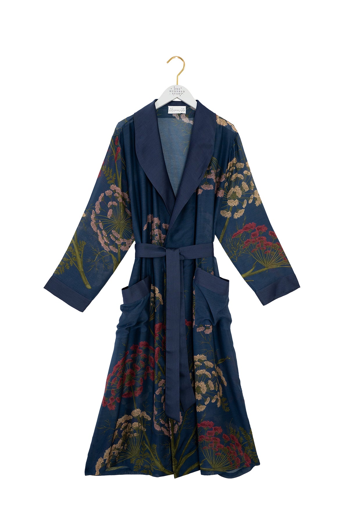 The lightweight design falls to an elegant long length and features a fold-over collar, complete with a self-tie waist belt and front patch pockets.