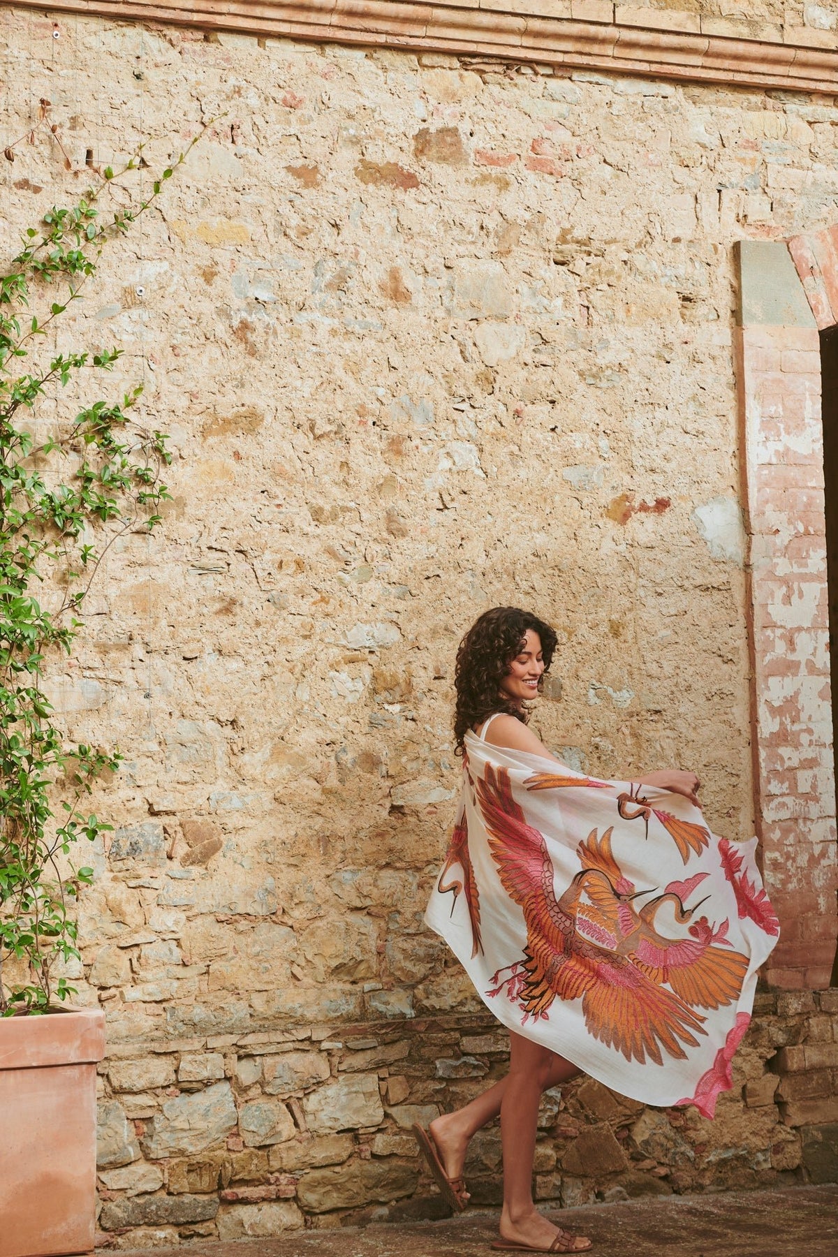 The crane symbolises good fortune in many cultures, and this vibrant print is undoubtedly something to celebrate! Featuring a bold background adorned with elegant birds in clever colour combinations. The pinks and oranges on the crane set off against the ecru background will make the wearer smile!