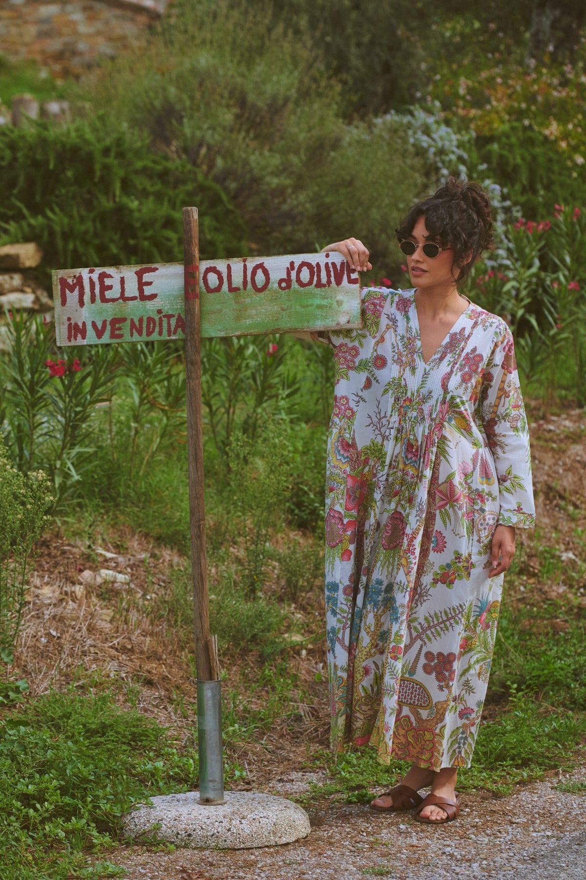 With its delicately pleated placket top leading down to a flowing maxi skirt, this dress showcases the entire One Hundred Stars signature print.