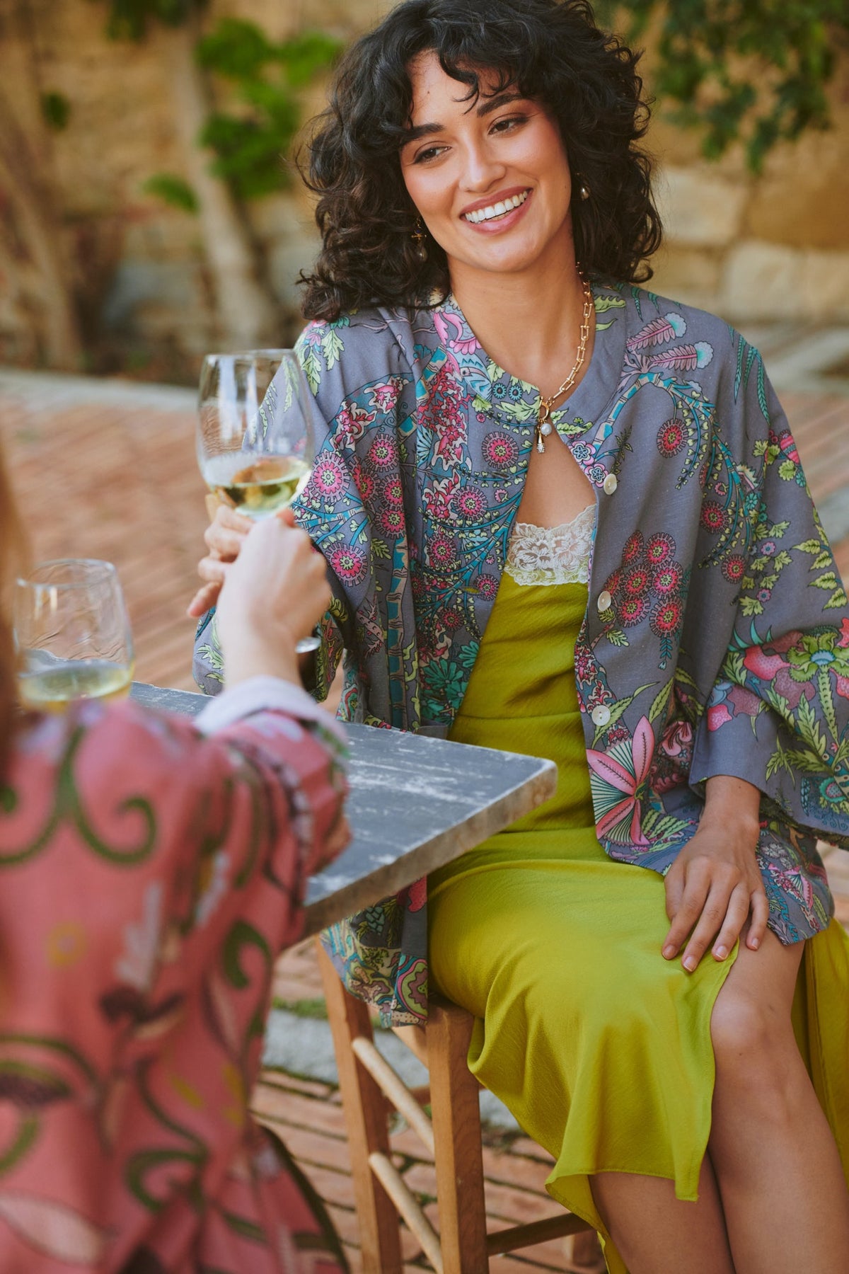 Our generously cut short cotton and linen mix jacket features a mandarin-style collar, ¾ length tapered sleeve, patch pockets and three beautiful mother-of-pearl buttons.